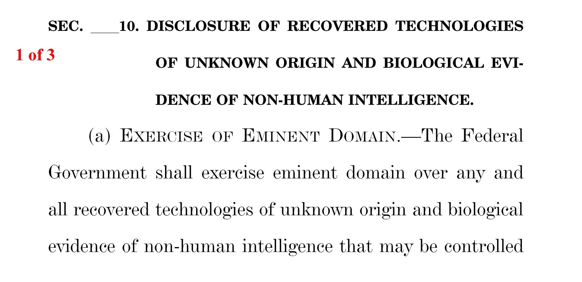 [UPDATE (July 14, 2023, 4:00 PM EDT): One provision of an amendment to the Senate's National Defense Authorization Act proposed on July 13 by Senators Schumer, Rounds, and others, described below, would reach beyond the universe of government-funded research and government-derived material, to assert that the federal government will establish ownership through eminent domain over "all recovered technologies of unknown origin and biological evidence of non-human intelligence that may be controlled by private persons or entities in the interests of the public good."]