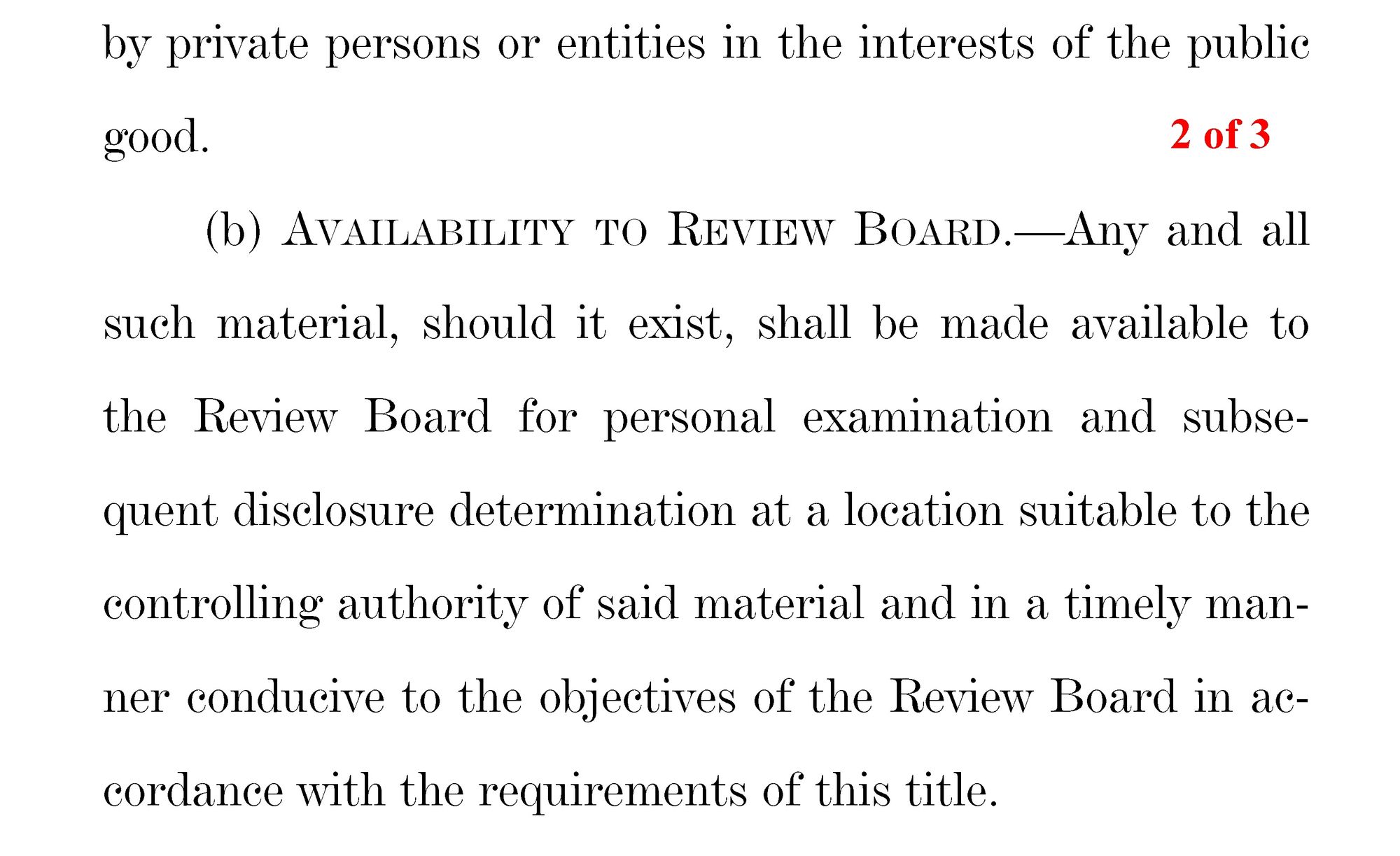 [UPDATE (July 14, 2023, 6:45 AM EDT): Late on July 13, 2023, the New York Times reported that Senate Majority Leader Chuck Schumer (D-NY) will seek approval of an amendment to establish a special commission "with broad authority to declassify government documents about U.F.O.s and extraterrestrial matters...modeled on the commission that oversaw the release of information about John F. Kennedy's assassination [enacted in 1992]."