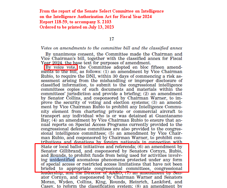 (12) February 16, 2024: Inserted an image of part of a page from the report of the Senate Select Committee on Intelligence, reporting on its adoption of the Gillibrand amendment on a voice vote, on June 14, 2023.