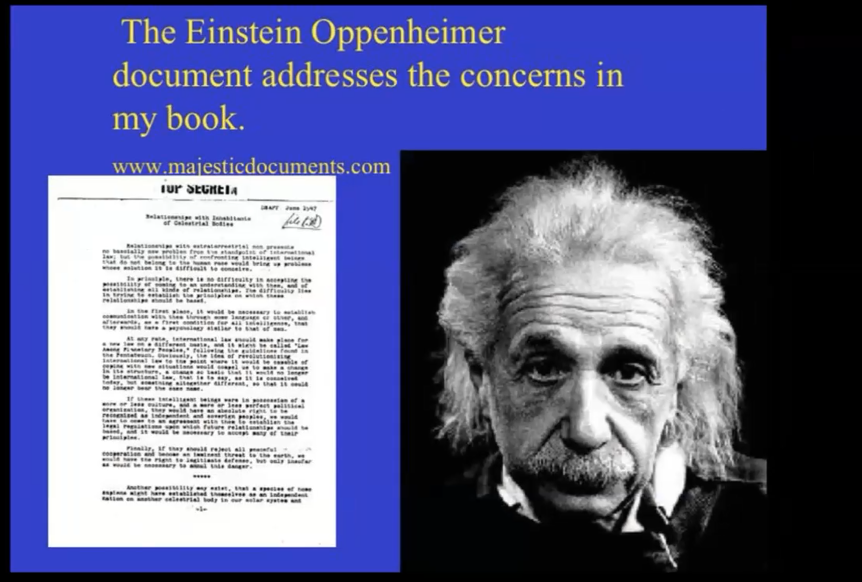 I consulted first with Barry Greenwood, a researcher greatly knowledgeable on many aspects of ufological history, including the MJ-12 hoaxes. He responded in an email, "It looks to me like the O/E [Oppenheimer/Einstein] document was created out of whole cloth, with discussion that I can't imagine would have been like anything Oppenheimer or Einstein would have written that could have served as a model for the fake." [1]