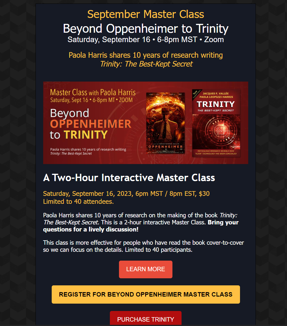 On September 16, 2023, Paola Harris presented an internet "master class," titled Beyond Oppenheimer to Trinity ($30 per ticket), that pitched the movie tie-in in explicit terms.