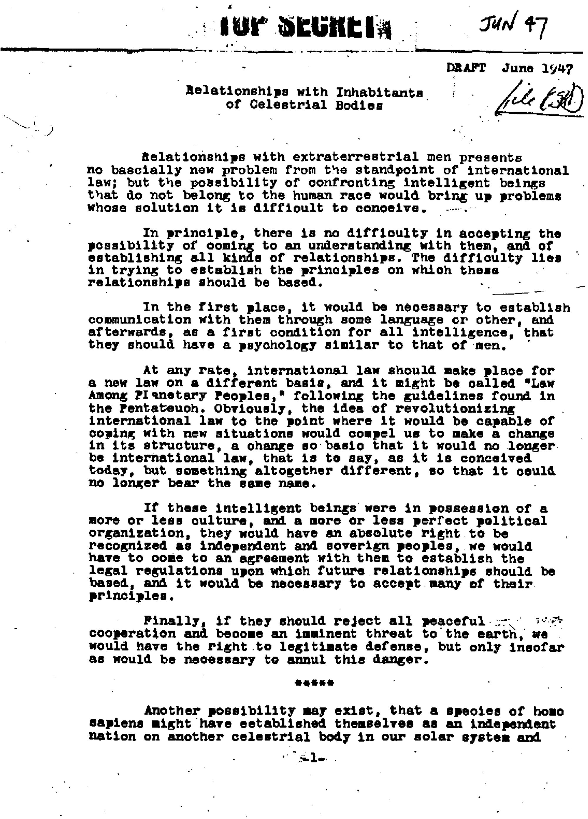 In pushing the imagined Oppenheimer-UFO link, Harris employs a document that she believes to be a letter written jointly by Oppenheimer and Albert Einstein to President Truman, titled "Relationships with Inhabitants of Celestrial [sic] Bodies. The document (reproduced below) is marked TOP SECRET and "draft," and dated "June 1947." Harris associates this document with "MJ-12," a never-substantiated secret government group that some believe was in charge of the UFO/alien subject, to which innumerable hoaxed documents have been attributed since the 1980s.