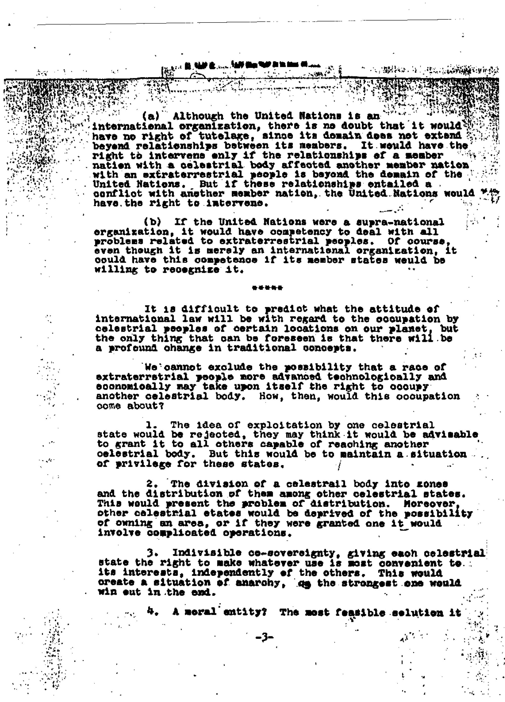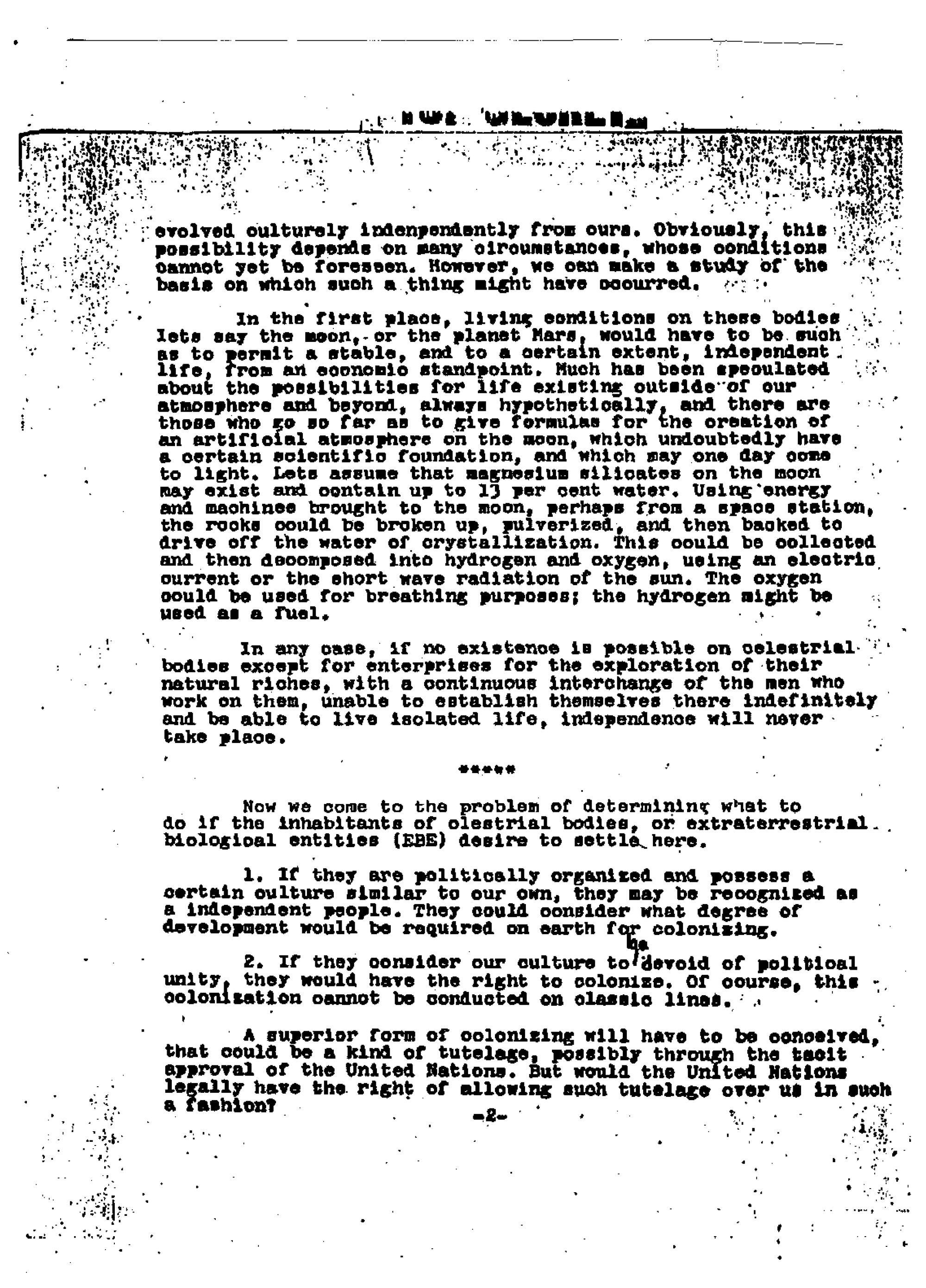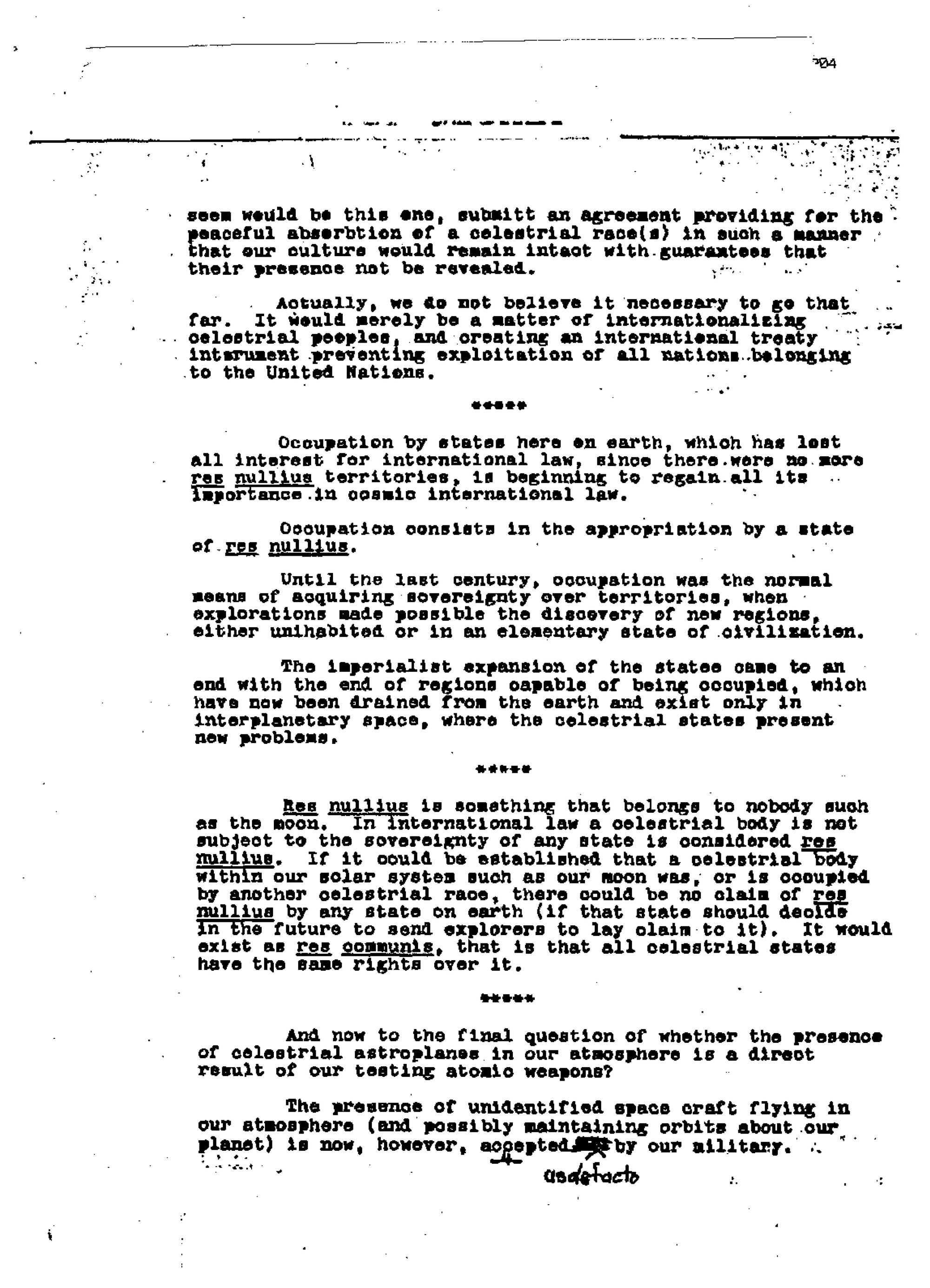 The document purports to be a discussion of issues raised by "relationships with extraterrestrial men," elsewhere referred to as "extraterrestrial biologic entities (EBE)," particularly if they wish "to settle here." The first four pages are so wretchedly written as to be virtually incoherent, besides being replete with misspellings. To the extent that this material conveys anything intelligible, it is filled with nonsensical statements– for example, the observation that "Another possibility may exist, that a species of homo sapiens might have established themselves as an independent nation on another celestrial [sic] body in our solar system and evolved culturally independent from ours." And, a call for international law to be replaced by "'Law Among Planetary Peoples,' following the Pentateuch" [the first five books of the Old Testament]. It is unfathomable to me that any person with a modicum of critical discernment could take this rambling nonsense to be an authentic product of either Oppenheimer or Einstein.