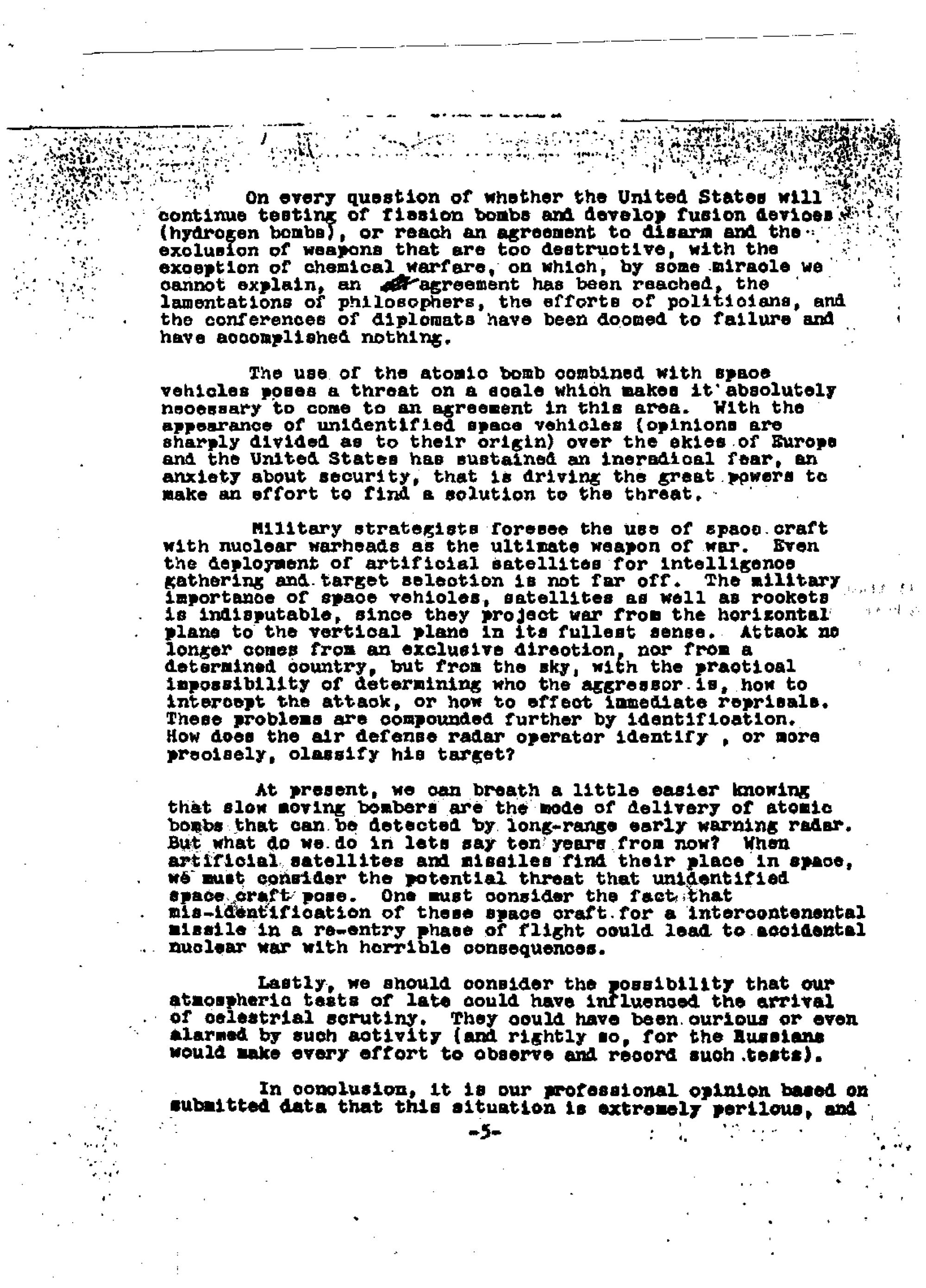 The voice of the document does shift near the bottom of page 4, beginning with this sentence, "And now to the final question of whether the presence of celestrial [sic] astroplanes in our atmosphere is a direct result of our testing atomic weapons?" Some of the material that follows -- barely more than a page-- is at least semi-coherent– for example, the expression of concern that ten years or so down the road, "mis-identification of these space-craft for an intercontenental [sic] missile in a re-entry phase of flight could lead to accidental nuclear war with horrible consequences."