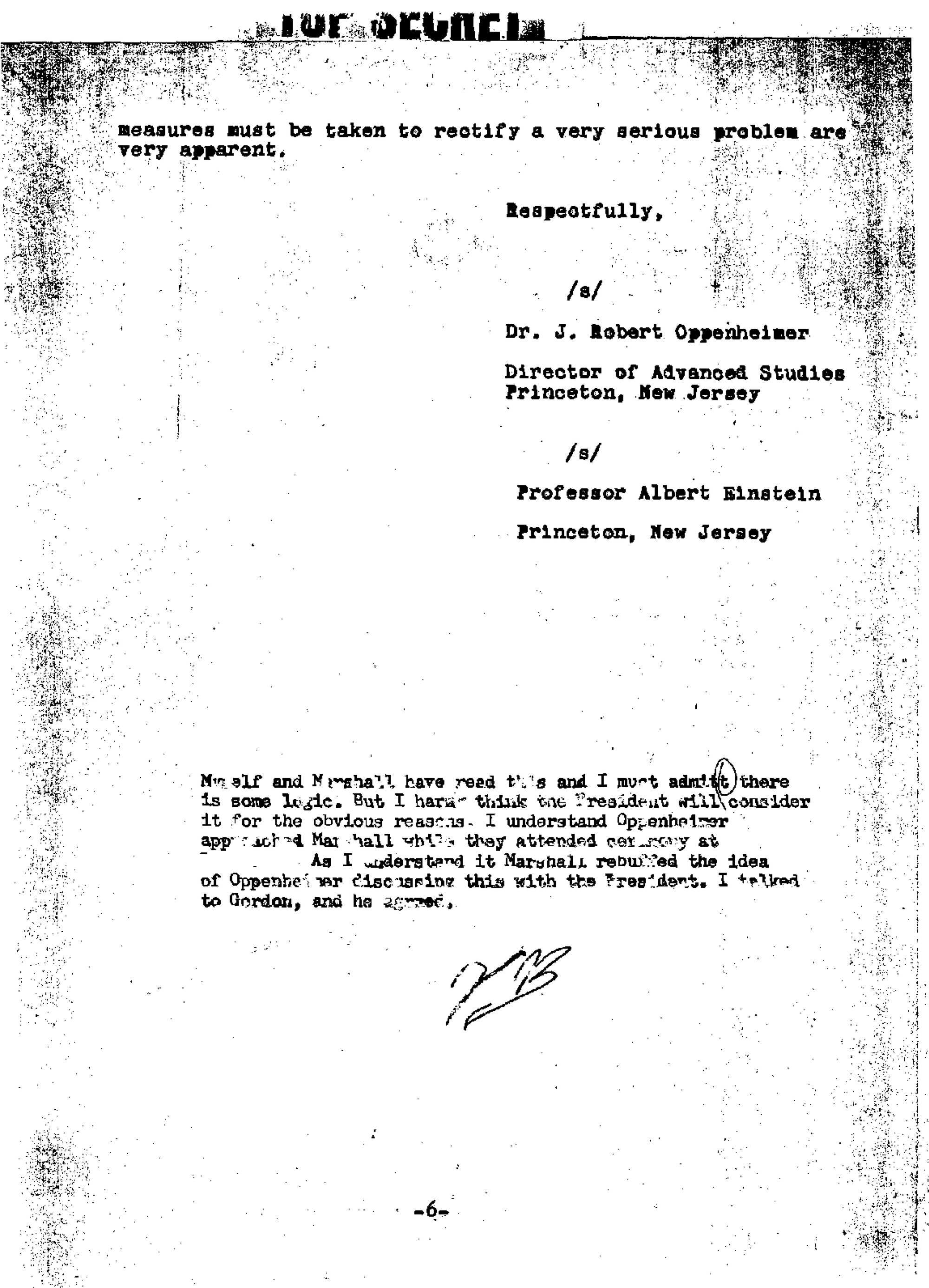 On the final page of the fake "Einstein-Oppenheimer" letter there appears a handwritten note, ostensibly written by Vannevar Bush, a leading government-affiliated science administrator during World War II and for a time thereafter (and, in MJ-12 lore, a leader of that shadowy group). The note indicated that Oppenheimer would not receive approval to discuss the matter with President Truman. It is possible that this note, at least, was lifted from some real document dealing with an unrelated subject, but if so, we have not identified the source.