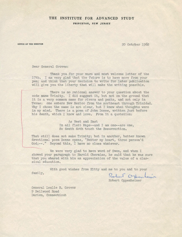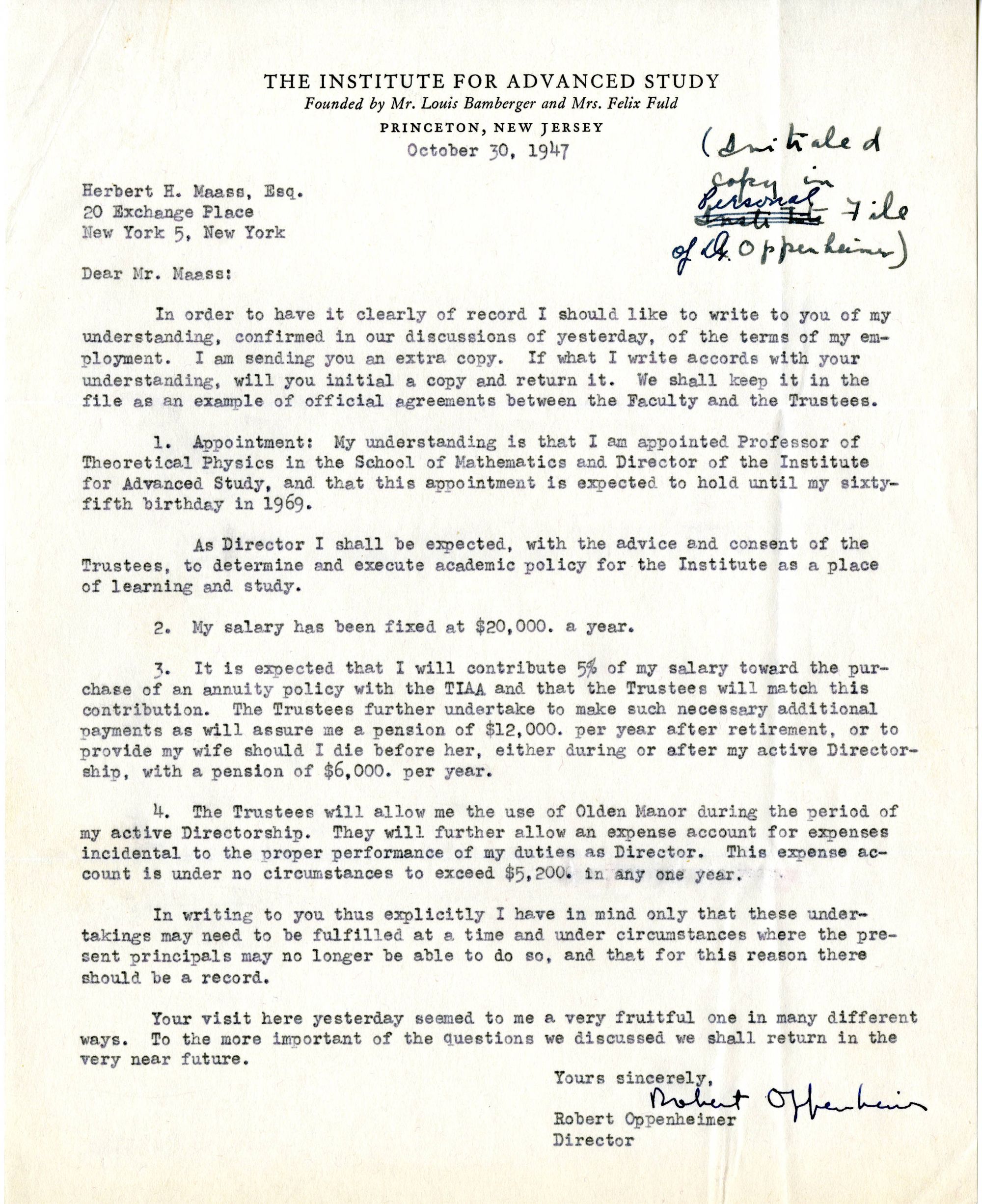 [UPDATE (October 3, 2023): Hat tip to KeithCEGJ on X/Twitter, who pointed out that in real letters sent by Oppenheimer, the name of his employer is "The Institute for Advanced Study," not "Advanced Studies" as seen in the Oppenheimer signature caption in the fake letter. Also, in authentic letters, Oppenheimer rendered his name, both written and typewritten, simply as "Robert Oppenheimer" not "J. Robert Oppenheimer" as seen in the fake letter. I've inserted two examples below for purposes of illustration.]