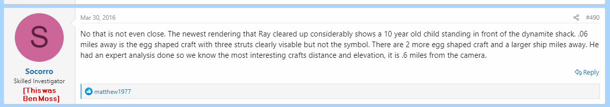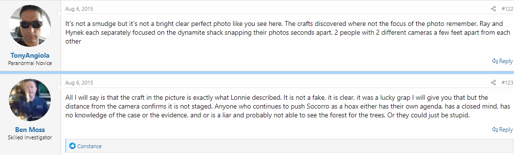 Mr. O'Brien was, for example, very positive about Ray Stanford's claims about the Socorro "dynamite shack photo." To reiterate: The nub of the claim was, as Stanford put it in a 2015 podcast appearance, to have taken "a wonderful photograph in which...people will be able to see, in broad daylight...the Socorro object [egg-shaped UFO], with its landing gear deployed."