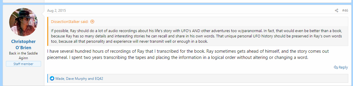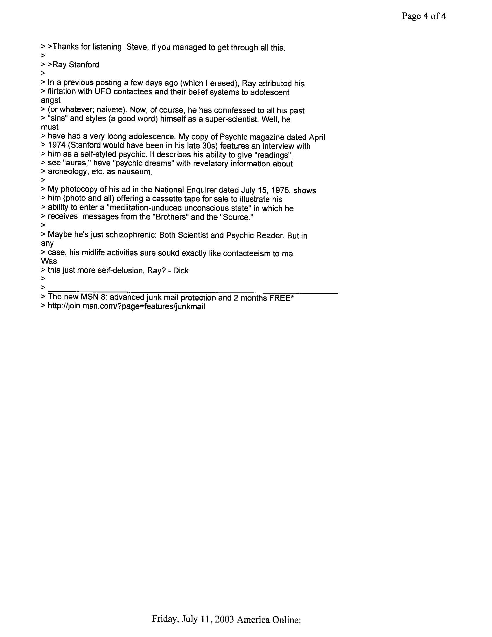 So, knowing all that, now consider this: In 2003, Ray Stanford wrote on a public listserv, "I never believed space beings were speaking through me, and all who know me well know that."