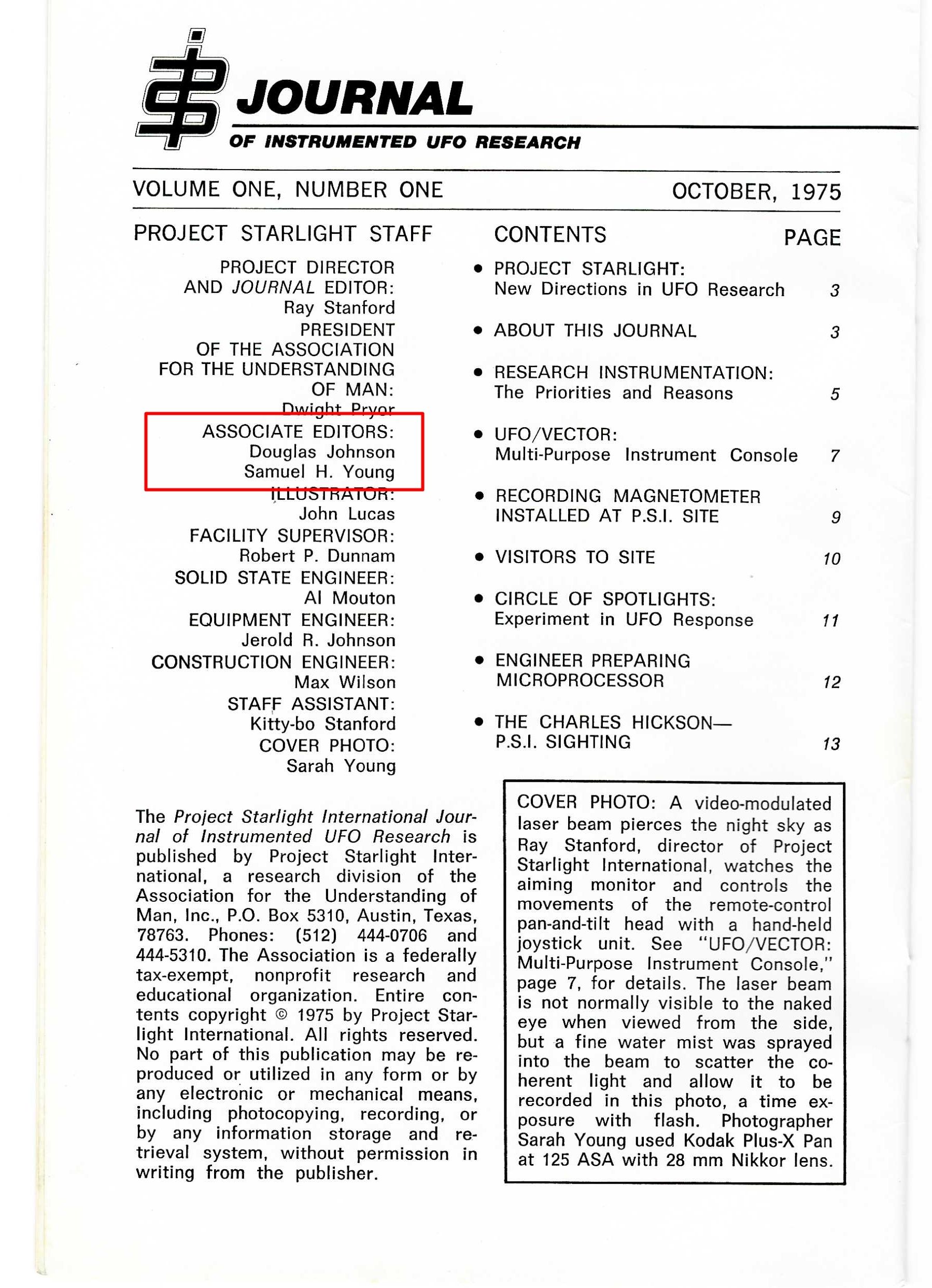 Material published by A.U.M. in 1973 and later (both printed and audio) contained ample material --both in the discourses by "the Source" and "the Brothers," and in material written directly by Stanford-- on the theme that Project Starlight International had the potential to establish a bridge between humanity and galactic civilizations. Notably, however, the P.S.I.-logo publications, papers, and press releases during the same period contained not a word of about psychic readings or "Brothers" -- even though most of the same people were on the both the A.U.M. and P.S.I. mastheads (with Stanford, of course, at the top of both -- "Editor-in-Chief" of the A.U.M. Journal (the first journal masthead appeared in 1976), and "Director" of Project Starlight International. In the material put out under the P.S.I. logo -- intended mainly for a different audience than the A.U.M. material -- P.S.I. was presented as an enterprise about getting "instrumented data" about UFOs. Setting aside the exaggerations, that was not untrue-- but it was only part of the truth.