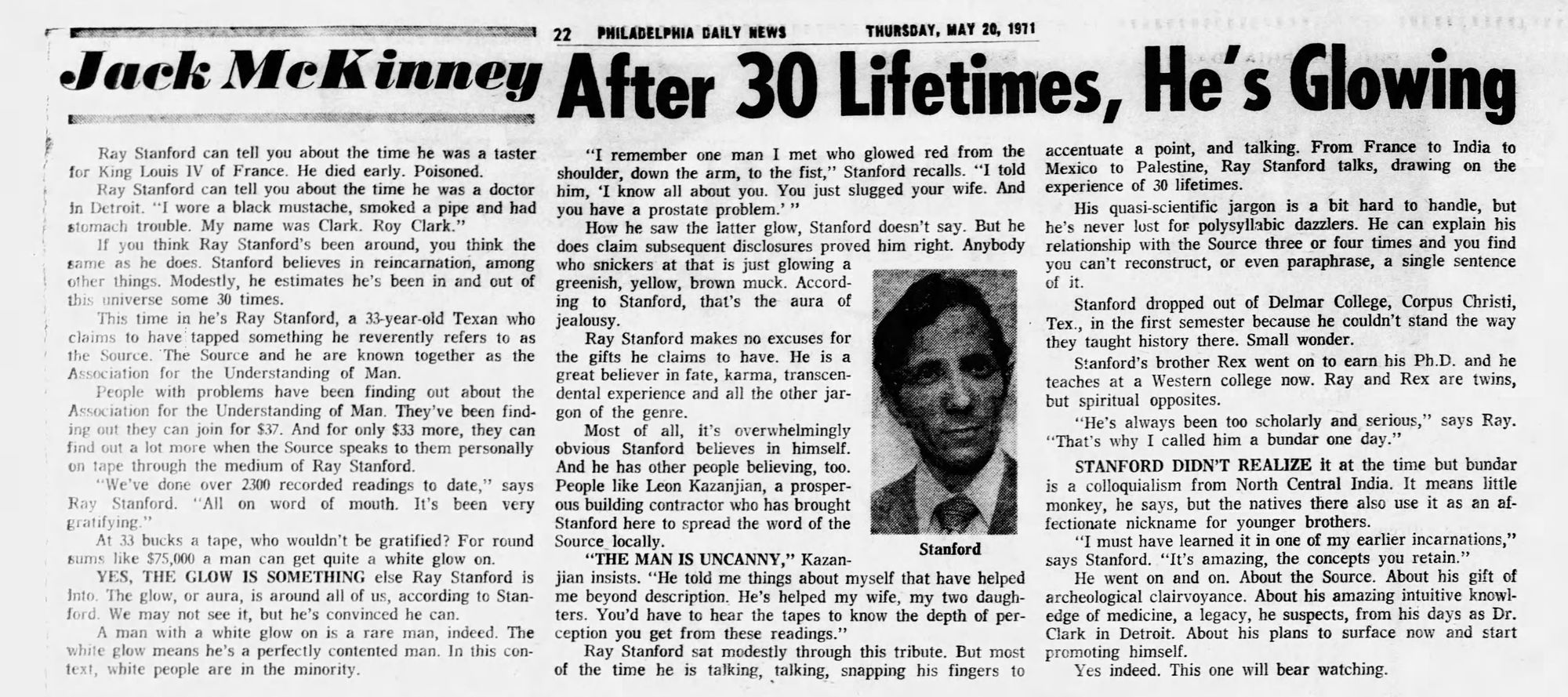 As a 1976 Stanford trance reading said, "He entered more than 40,000 years ago, and every incarnation has been pointing to the present time." Of course, the channeled voices stressed, Stanford could only achieve these great purposes with the dedicated support of others, who would be required to overlook certain flaws in the "channel."
