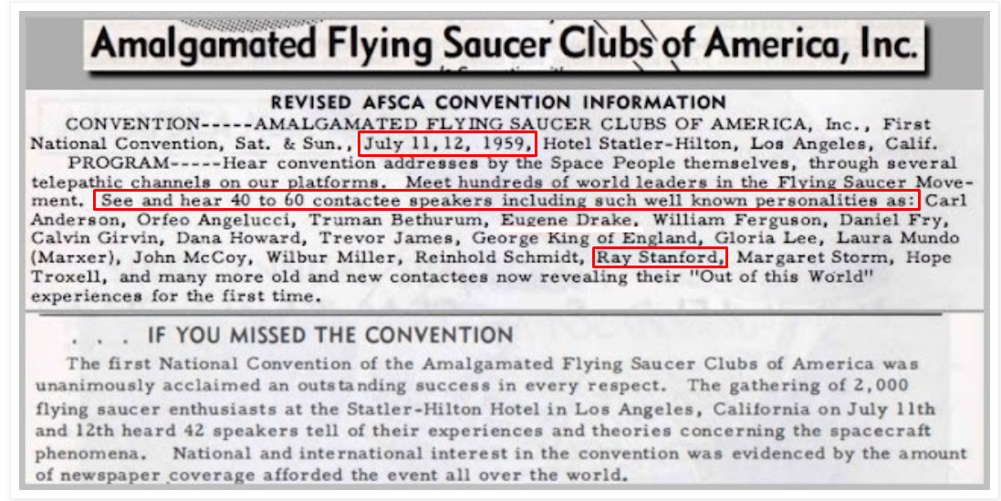 One problem with that: At least as late as August 1974, Stanford was wowing the members of the Association for the Understanding of Man with earnest, dramatic accounts of his purported telepathic interactions with the space "brothers" (including Aramda), in those very same 1950s events. I was there when Stanford delivered, at a conference of the Association for the Understanding of Man, a lecture titled "Firsthand Contacts with Extraterrestrial Life," on August 24, 1974. I was an A.U.M. member in good standing, I paid the conference registration fee, and I recorded the lecture on my personal device, as did others present.
