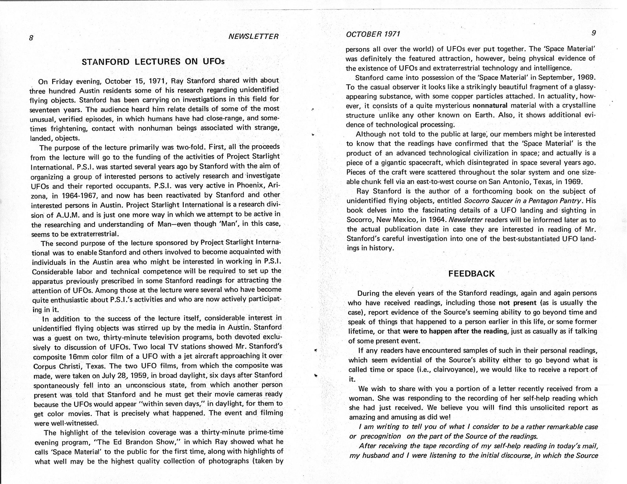 AUM Journal Vol. 2, No. 2 contains a transcript (embedded below) of a Ray Stanford "work reading" given on October 21, 1973. A "work reading" was a reading conducted by members of the core group for the specific purpose of guiding the leaders of the organization (including, in theory, Stanford himself) as to what they should be concentrating on at any given time, to admonish and encourage, to answer practical questions, etc. Most such readings were not published, but some were published, at least in part. In this case, the Journal editors wrote in a preface (page 52) that P.S.I. was aimed at "getting significant UFO evidence and toward possible intelligent response from or contact with UFO operators." (italics added for emphasis) The editors felt that publishing the explicit guidance from "the Source" would make its membership feel more comfortable with the fact that "considerable time and energies of A.U.M. have been invested in pursing the purposes of Project Starlight International. . ."