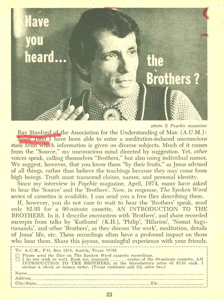 Well, it is not possible to know exactly what Stanford "believed" at any given time– but if Stanford did not believe that any extraterrestrials were speaking through him during the 1970s, then Stanford was blatantly lying to the A.U.M. members and donors in the 1970s, because during the era Stanford repeatedly and explicitly endorsed the claimed identity and the elevated authority of the most frequent of the purported extraterrestrial communicators, "Aramda" of "The Planet Keepers" (AKA "The Watchers"). Indeed, Stanford (in lectures, while awake) claimed to have been associated with Aramda for 38,000 years. Further down in this article I embedded audio clips of Stanford talking about Aramda in a 1974 lecture that I attended, and channeling Aramda at a 1973 A.U.M. conference. And, as already noted, I have embedded near the end of this article a recording of a lecture that Ray Stanford gave at an A.U.M. conference on August 24, 1974, for which I was present, titled "First-Hand Contracts with Extraterrestrial Life," in which Stanford related with much vivid detail his 1950s adventures with the Space Brothers, including Aramda. No one who listens to this 1974 recording would receive any impression that Stanford was skeptical of the objective reality of the experiences that he so vividly related, including the mystical experience induced by the ET beam on January 5, 1957.]