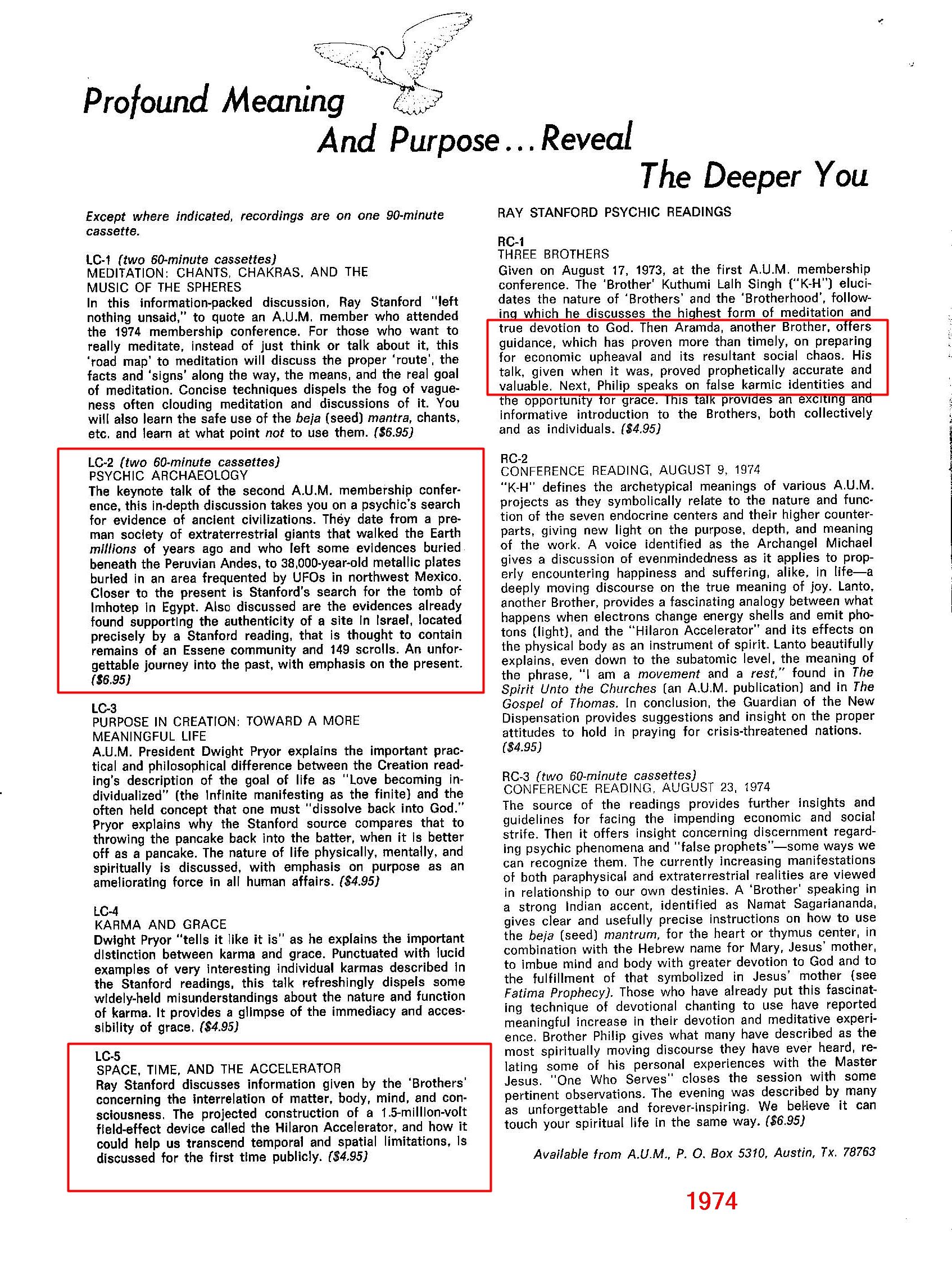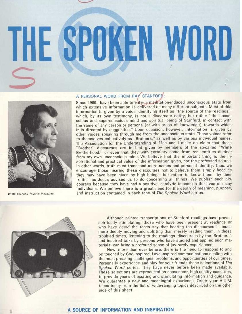 Although Ray Stanford was officially an employee of A.U.M., the overarching purpose of the entire enterprise was to advance the teachings and projects promoted by Stanford's "psychic readings" -- that is, by voices emanating from the vocal cords of the purportedly unconscious Ray Stanford, presented as originating with members of the "White Brotherhood" (the term had no racial connotation, but related to metaphysical mythology)-- ostensibly autonomous, spiritually elevated entities; and also from "the Source of the Readings," described in official A.U.M. literature as "the unconscious and superconscious mind and spiritual being of Stanford in contact with same of any person or persons or with any areas of knowledge toward which it is directed by suggestion." The official A.U.M. introductory brochure published in 1974 described Stanford as "a psychic of uncommon ability."