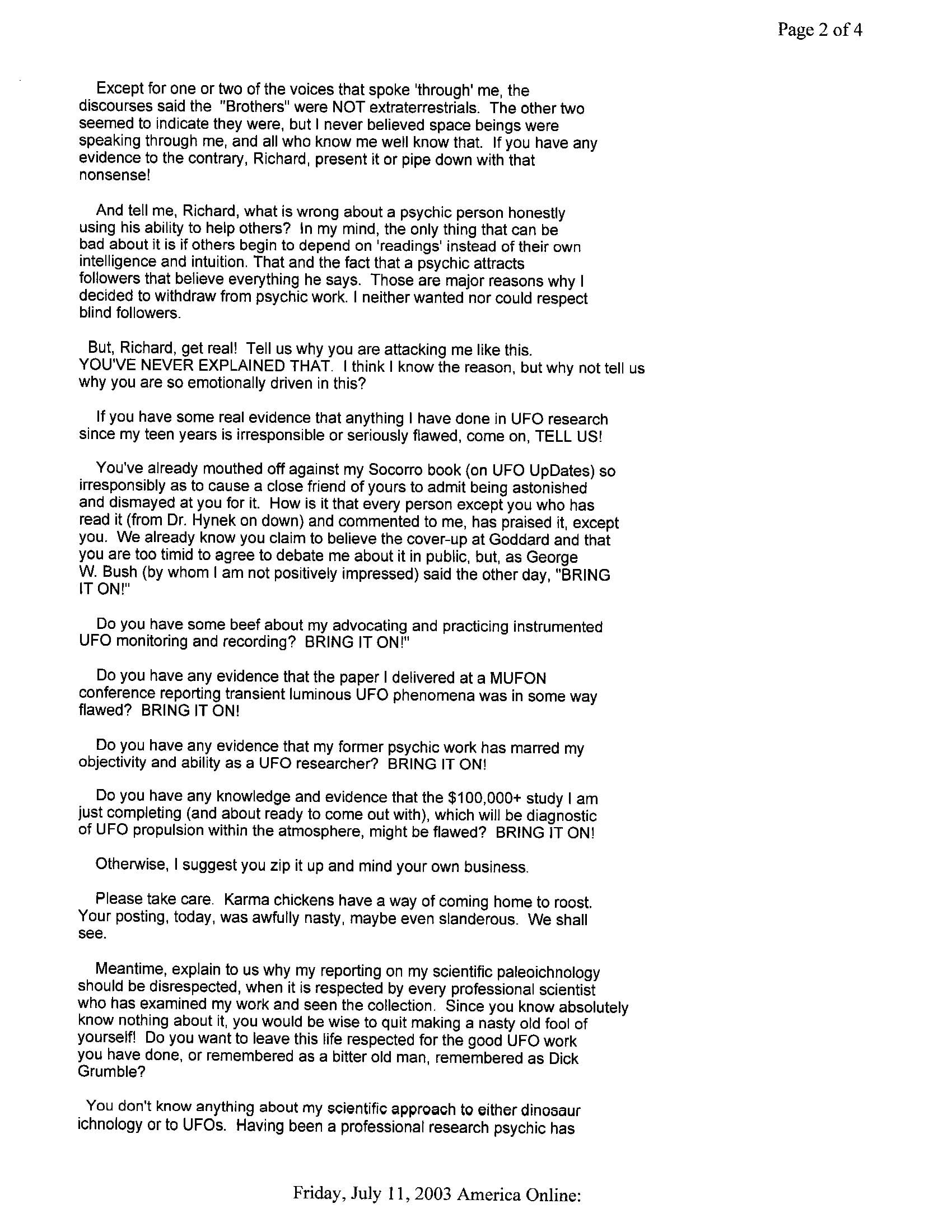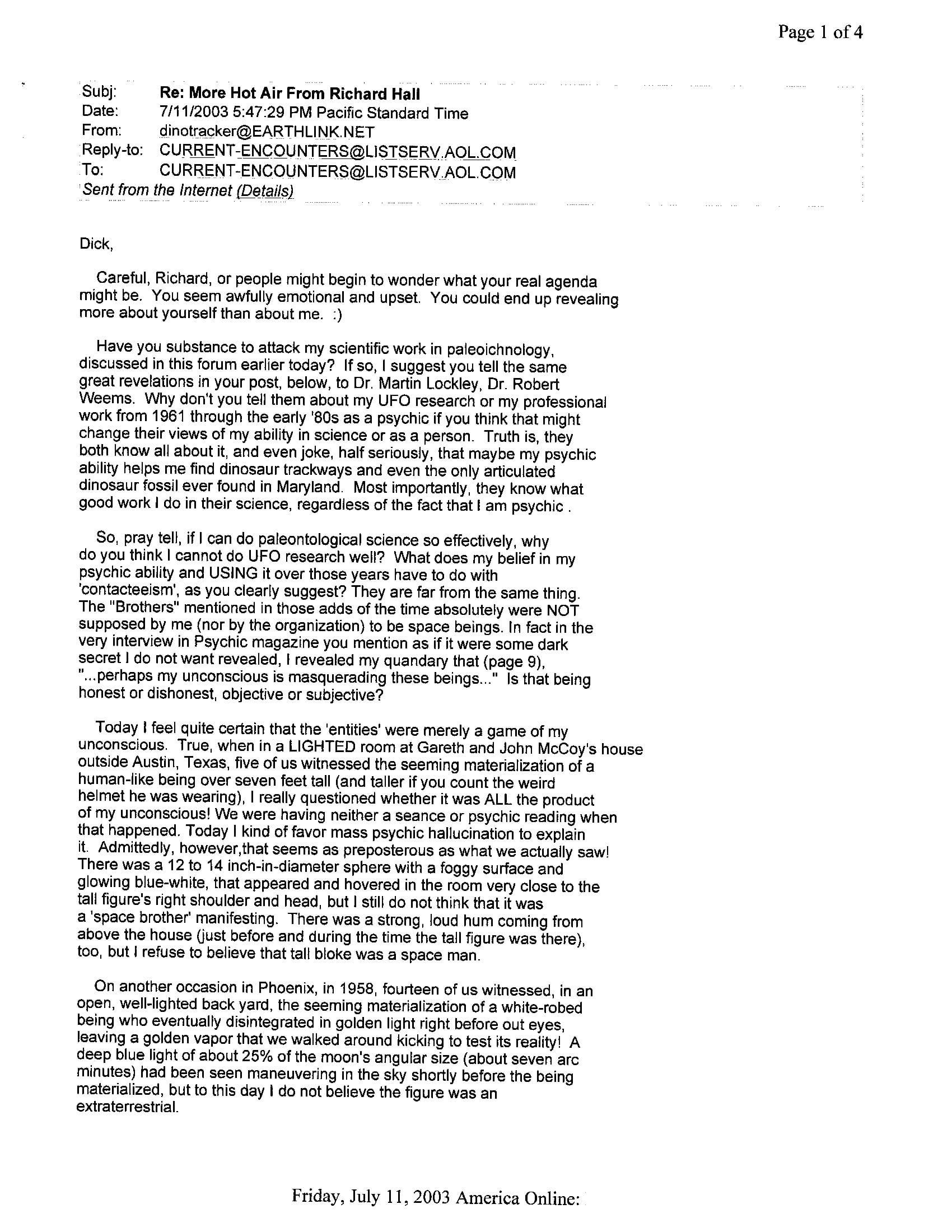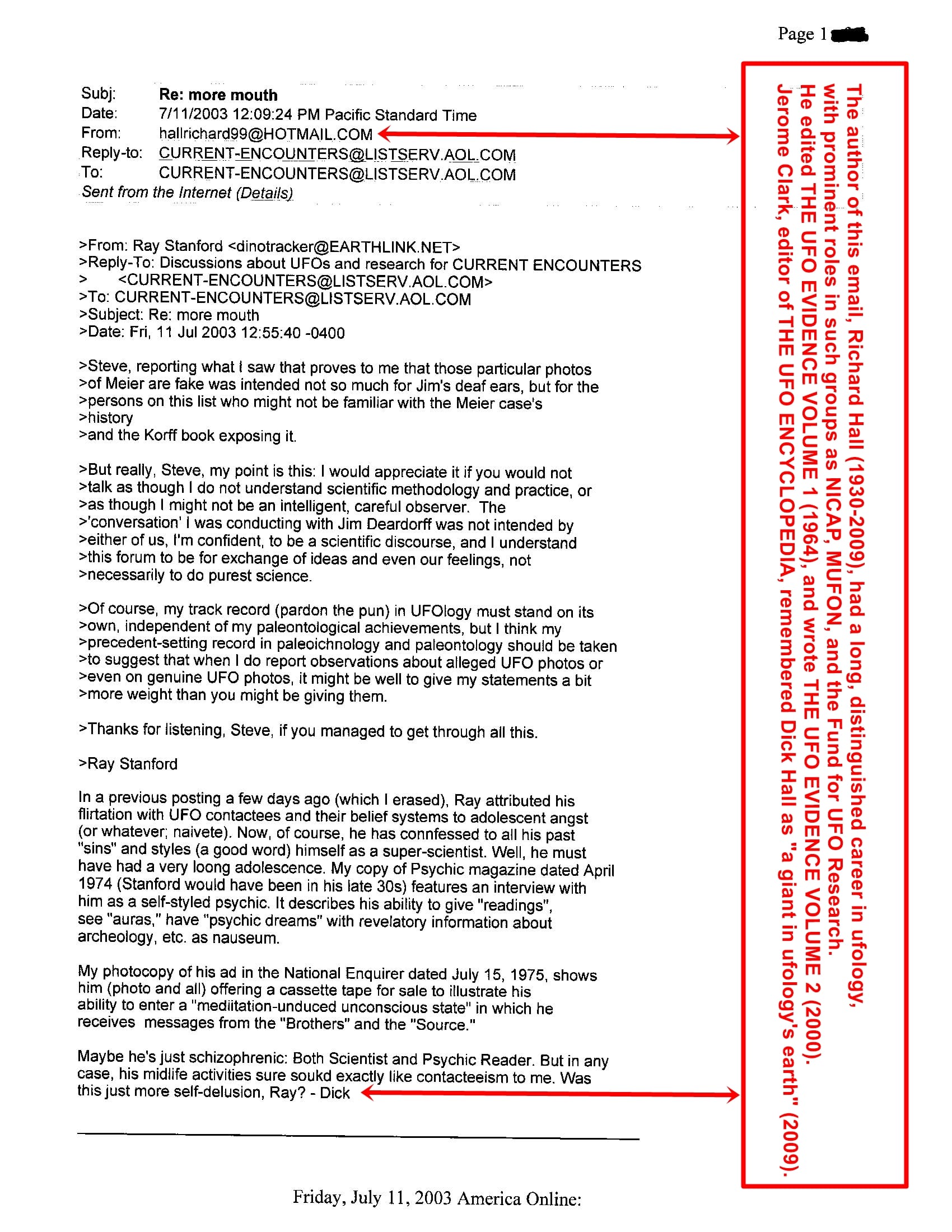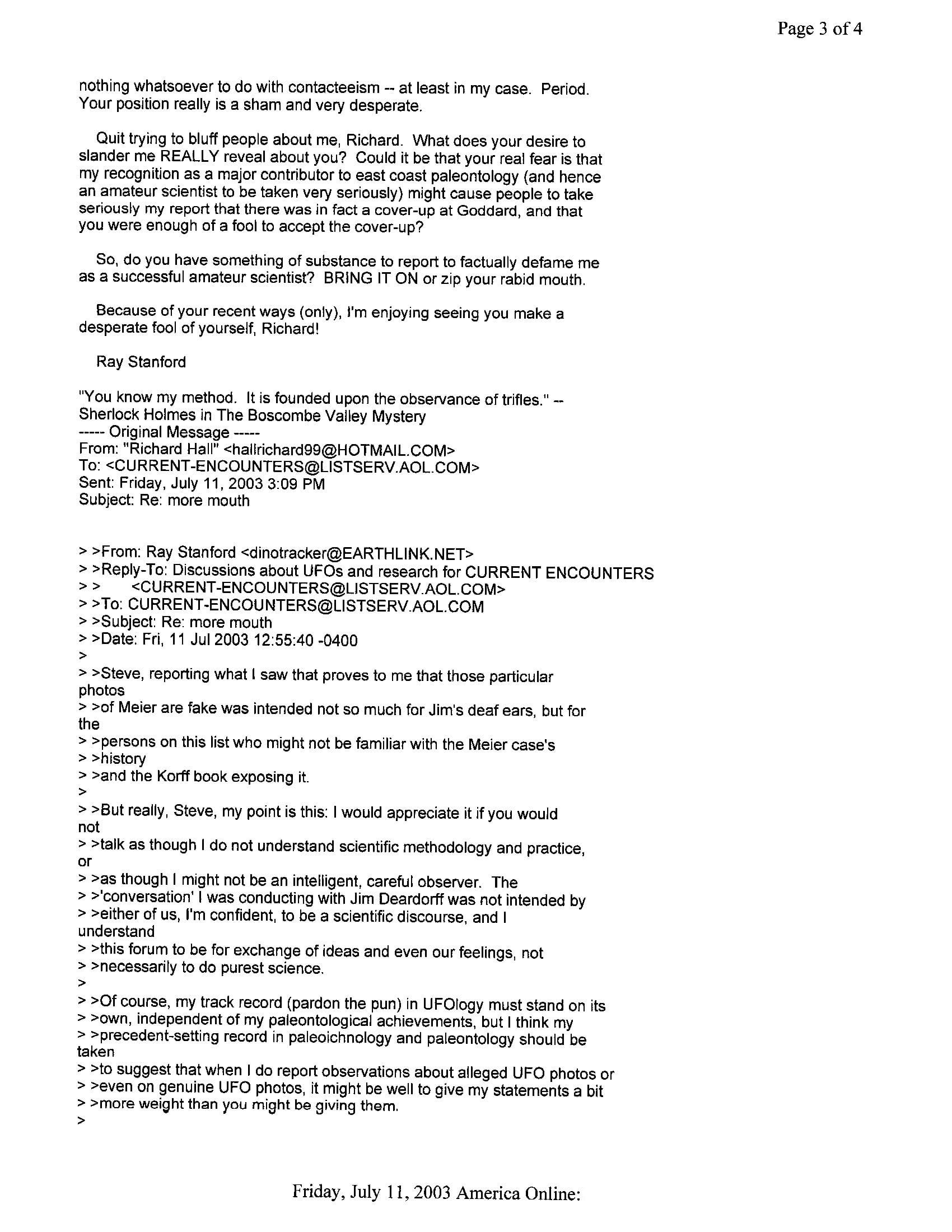 [1] In an update that I added near the top of this article on April 9, 2024, I summarized a sharp exchange that occurred on an AOL list serve between Ray Stanford and Richard (Dick) Hall, a respected UFO researcher and author, on July 11, 2003, regarding Stanford's conflicting statements about receiving/channeling direct communications from certain extraterrestrials. Here are images of the entire 2003 exchange. The annotations in red are mine.